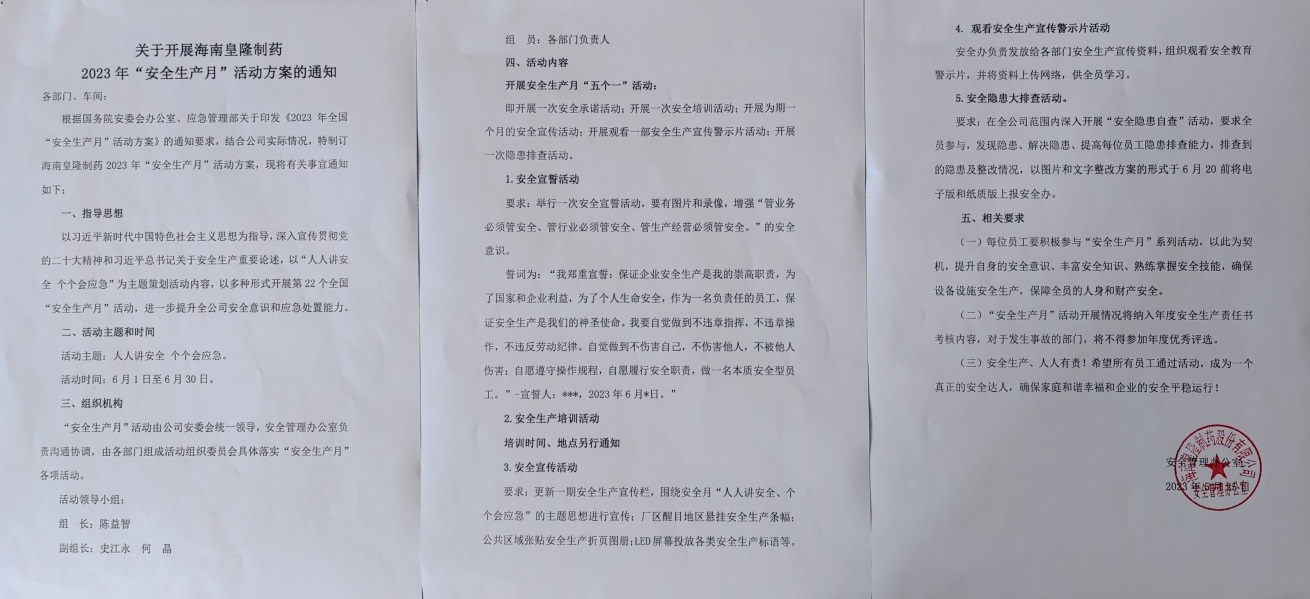 根據國家、省、市、區(qū)相關文件精神,結合公司實際,海南皇隆制藥股份有限公司制定了2023年“安全生產月”活動方案,并開展了以“人人講安全,個個會應急”為主題的系列活動,進一步提升了公司全員安全意識和應急處置能力。